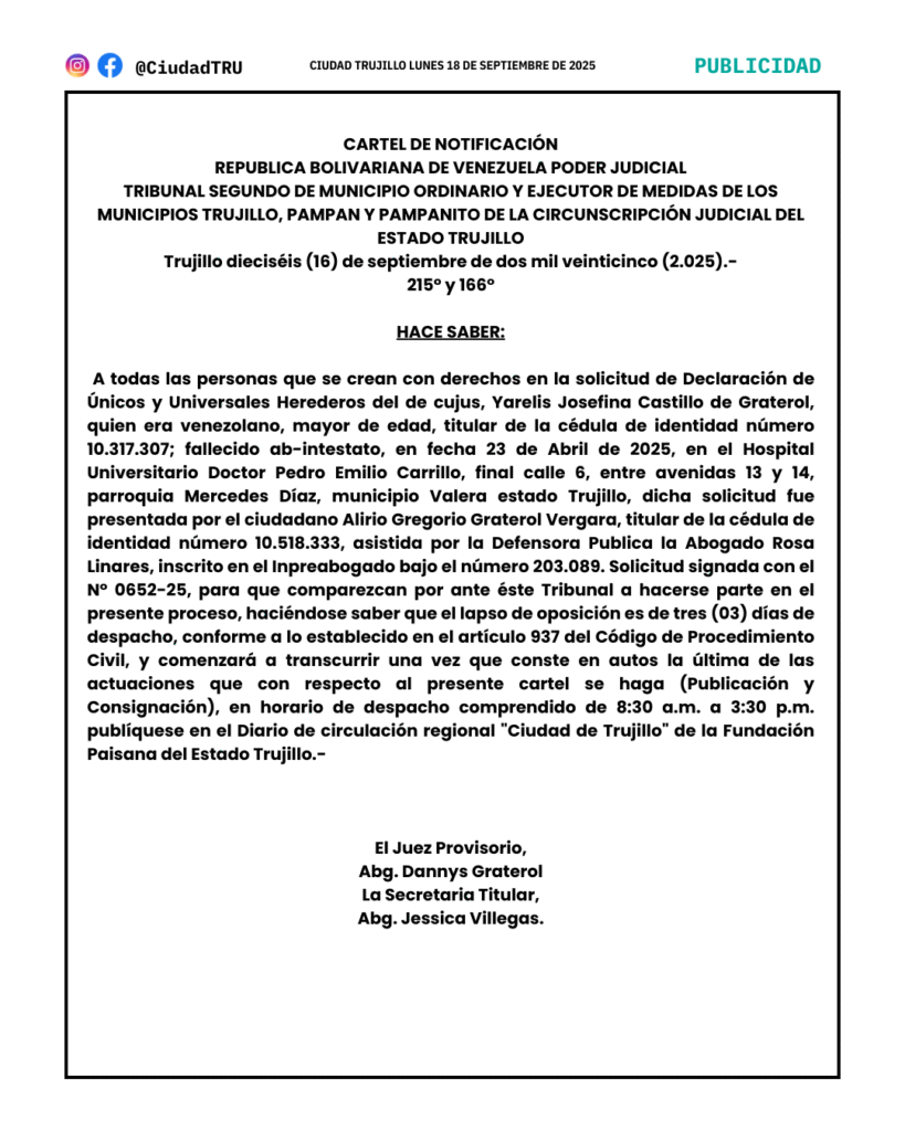 Yarelis Josefina Castillo de Graterol: Declaración de Únicos y Universales Herederos