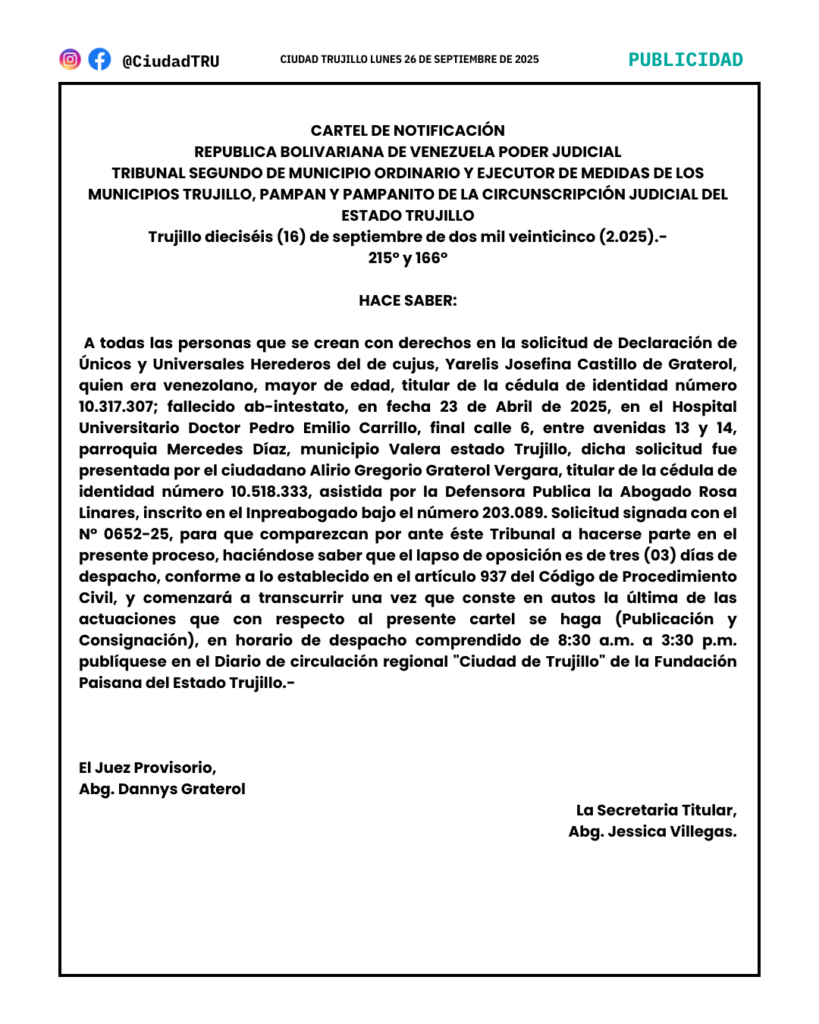 Yarelis Josefina Castillo de Graterol: Solicitud de Declaración de Únicos y Universales Herederos