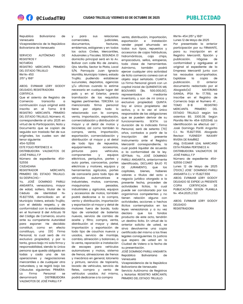 DISTRIBUIDORA VALEMOTOS DE JOSÉ PARILLI, F.P