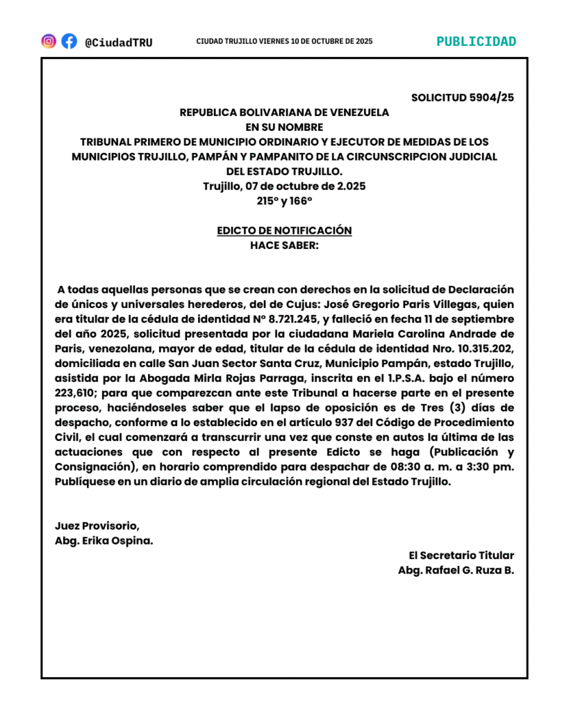 José Gregorio Paris Villegas: Solicitud de Declaración de únicos y universales herederos, del de Cujus
