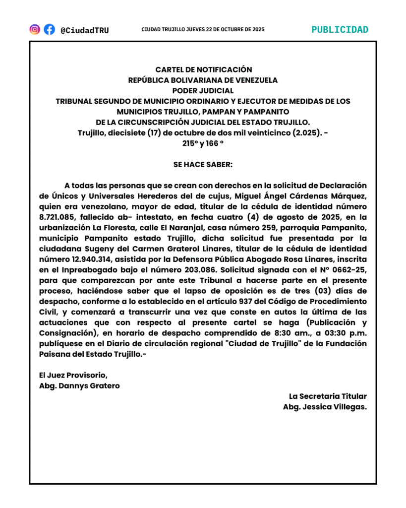 Miguel Ángel Cárdenas Márquez: Solicitud de Declaración de Únicos y Universales Herederos