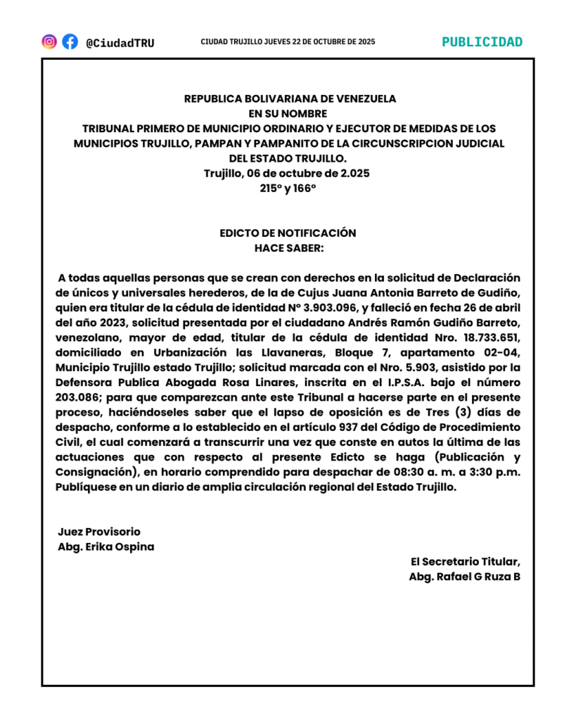 Juana Antonia Barreto de Gudiño: Solicitud de Declaración de únicos y universales herederos