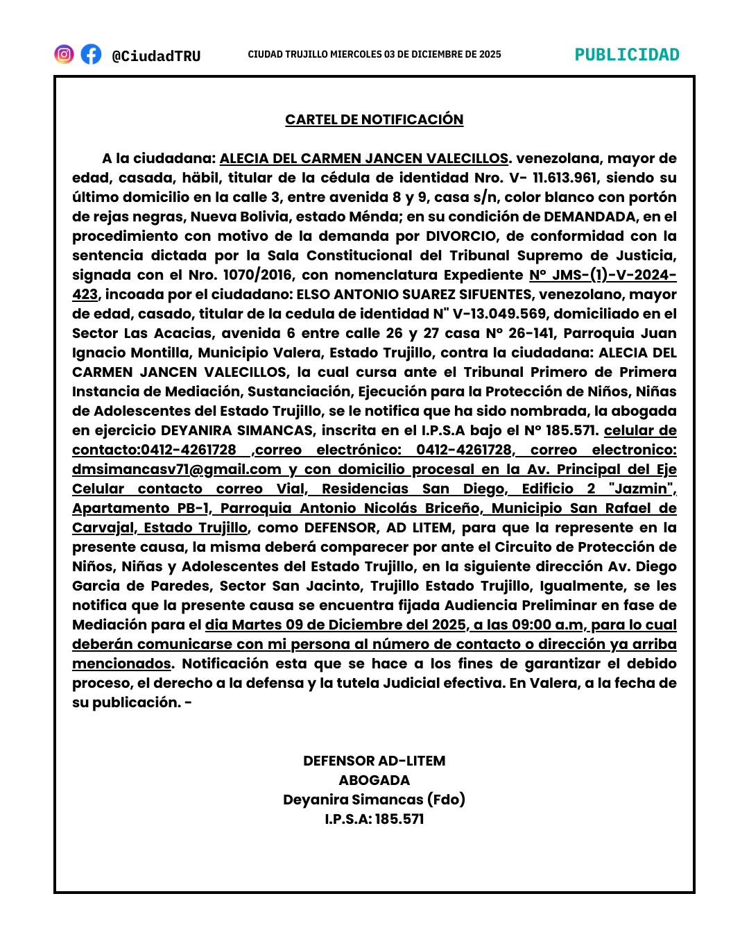 • CARTEL DE NOTIFICACIÓN: Alecia del Carmen Jancen Valecillos