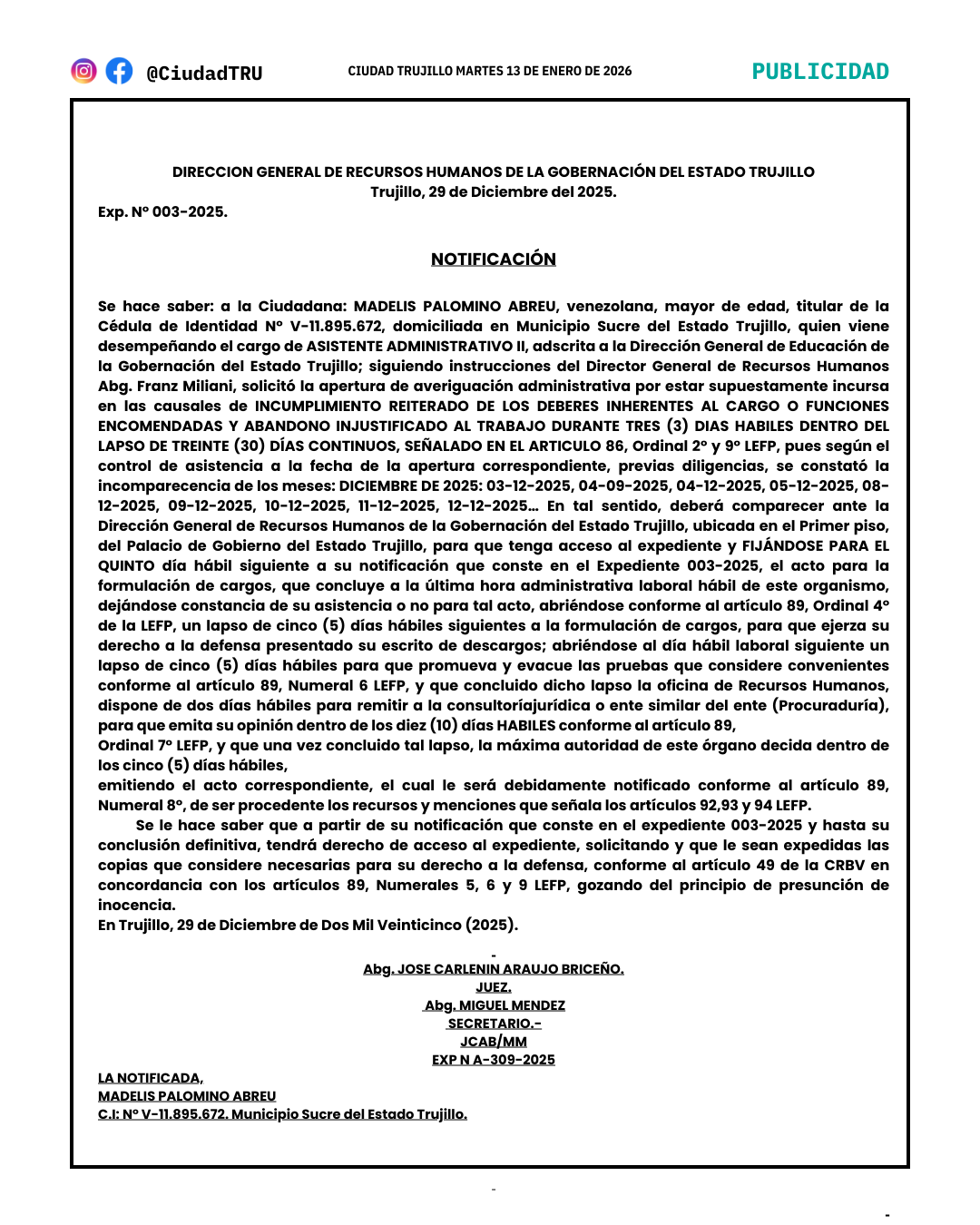 • Notificación: Madelis Palomino Abreu