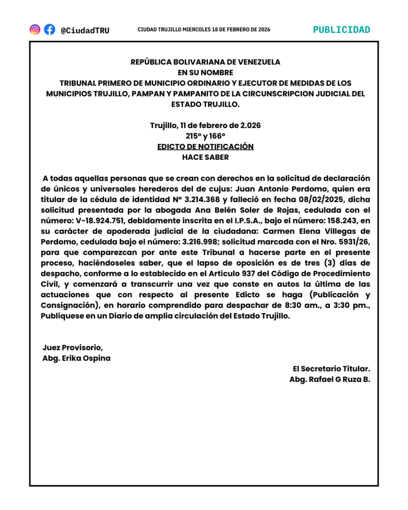 A todas aquellas personas que se crean con derechos en la solicitud de declaración de únicos y universales herederos del de cujus: Juan Antonio Perdomo