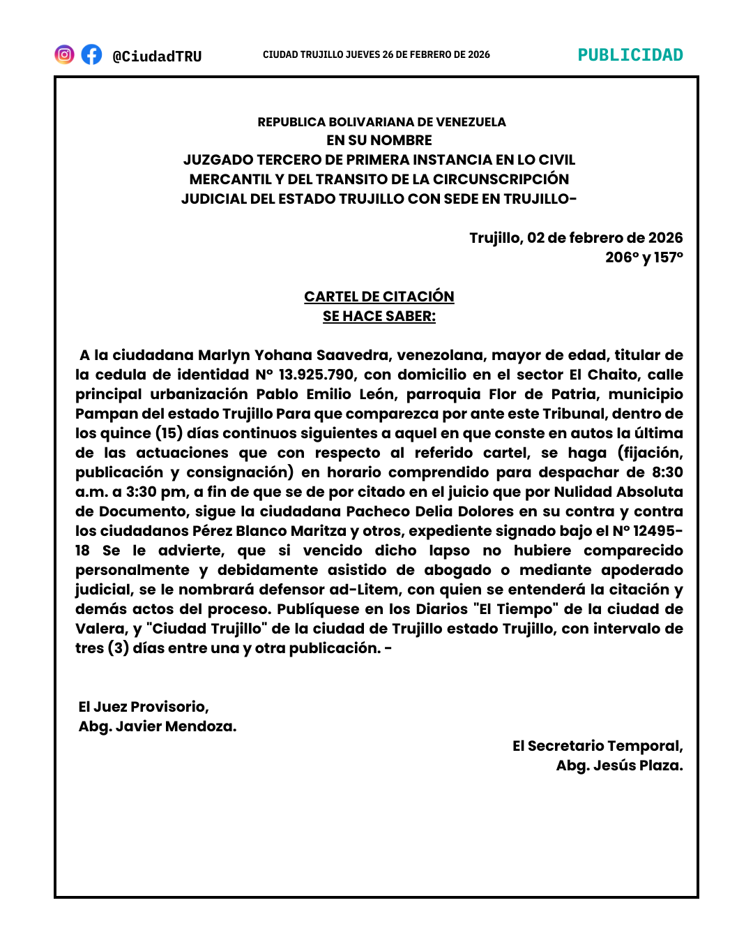 CARTEL DE CITACIÓN: Marlyn Yohana Saavedra