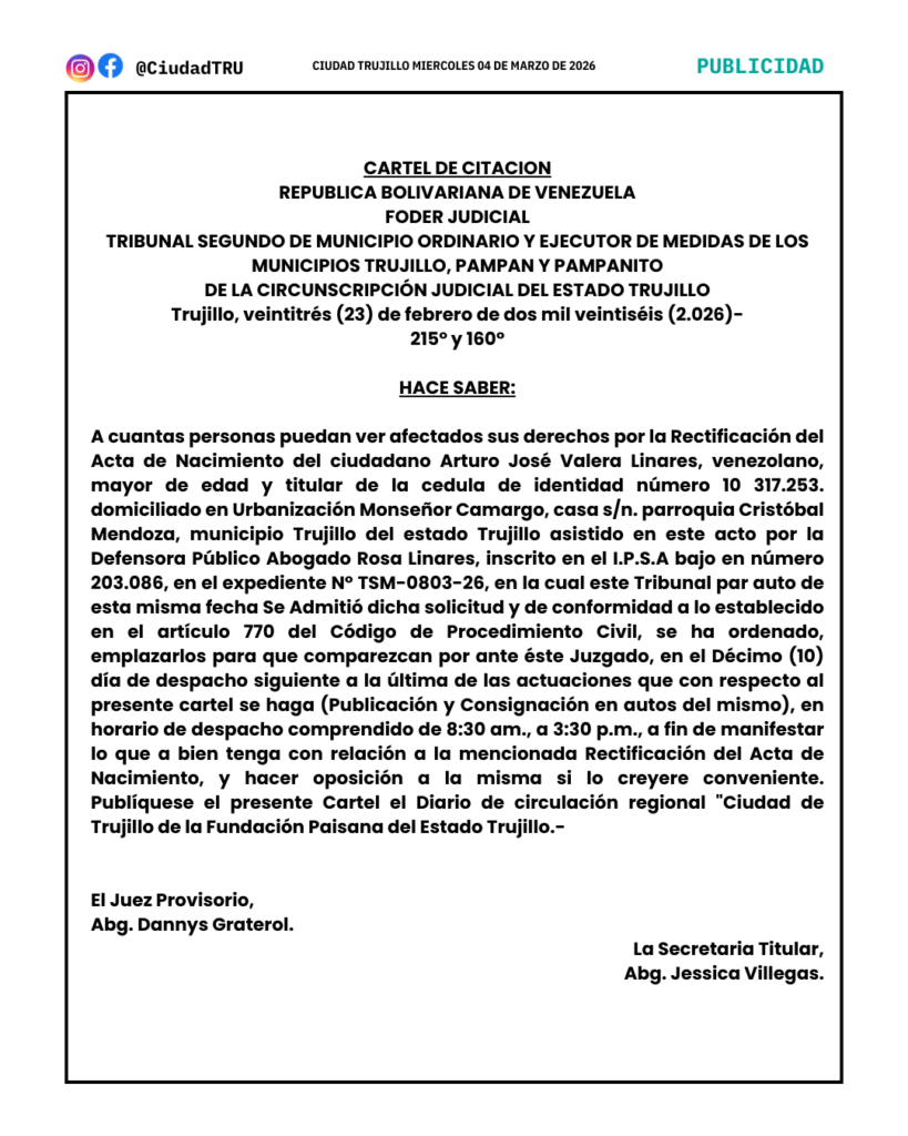 • Rectificación del Acta de Nacimiento del ciudadano Arturo José Valera Linares