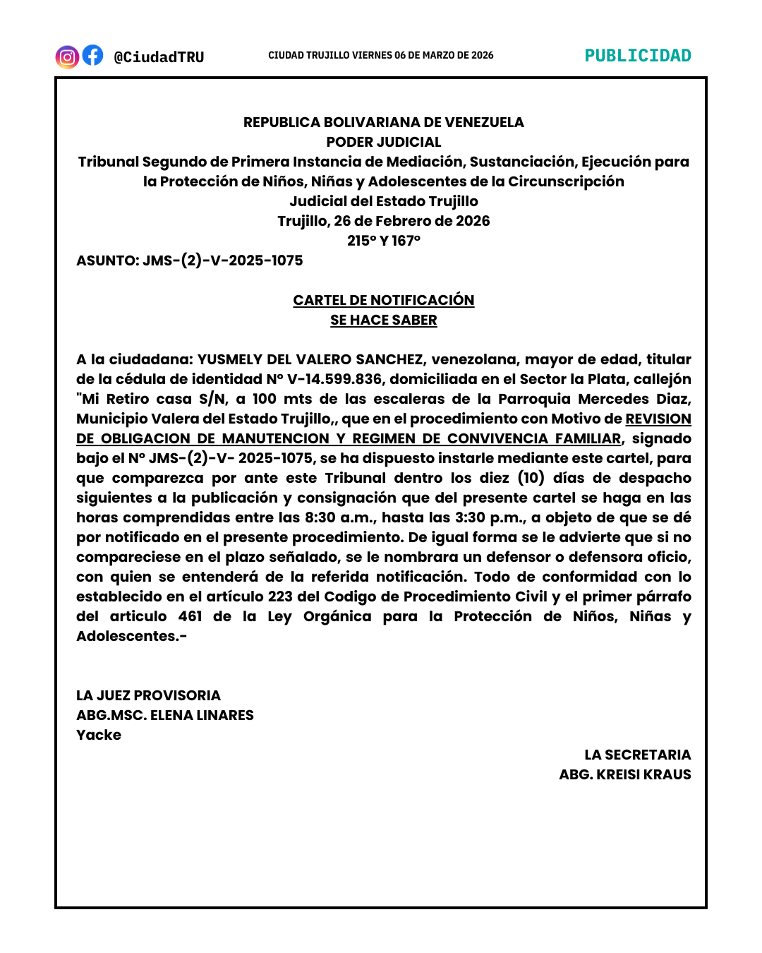 NOTIFICACIÓN: YUSMELY DEL VALERO SANCHEZ