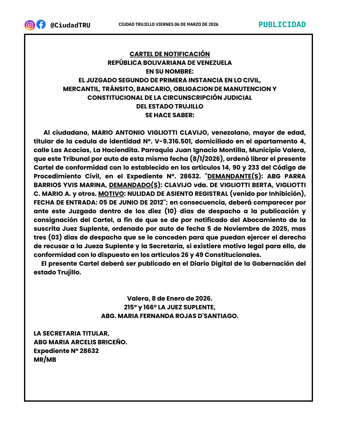 Notificación: MARIO ANTONIO VIGLIOTTI CLAVIJO