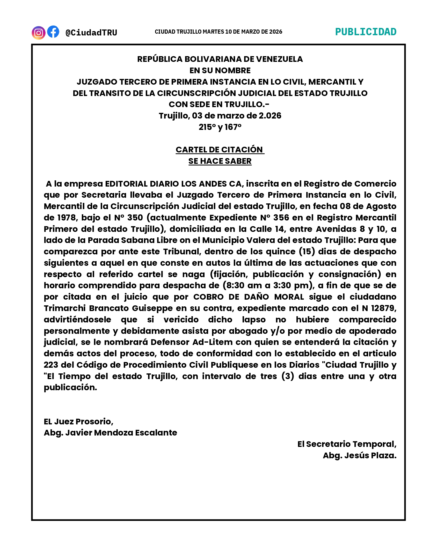 CARTEL DE CITACIÓN: EDITORIAL DIARIO LOS ANDES CA