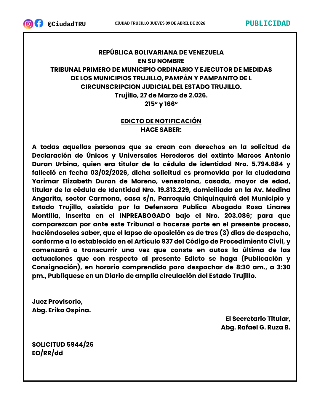 EDICTO: Marcos Antonio Duran Urbina