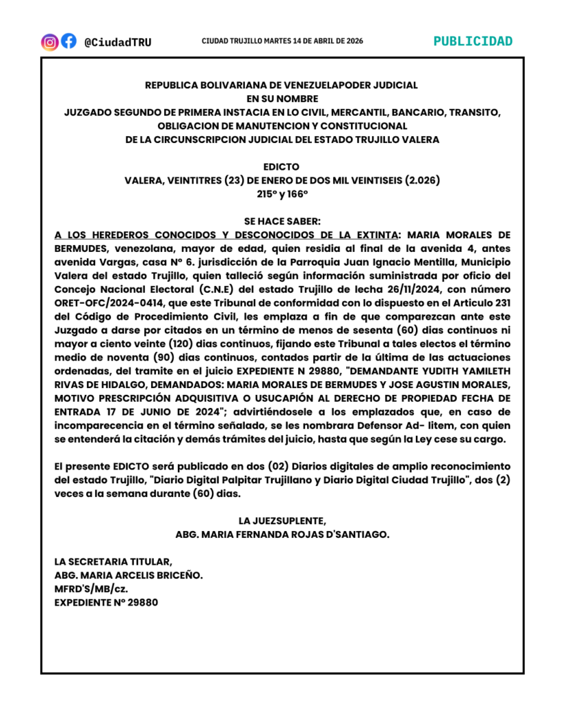 A LOS HEREDEROS CONOCIDOS Y DESCONOCIDOS DE LA EXTINTA: MARIA MORALES DE BERMUDES
