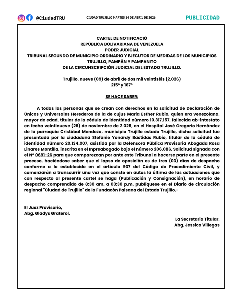 A todas las personas que se crean con derechos en la solicitud de Declaración de Únicos y Universales Herederos de la de cujus Maria Esther Rubio