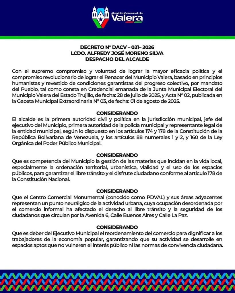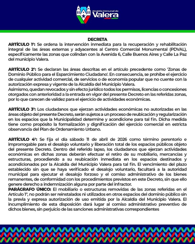 En aras de proceder con la rehabilitación integral de las áreas internas, externas y adyacentes al Centro Comercial Monumental, mejor conocido como Pdval, ubicado en la Avenida 6, con calles Buenos Aires y La Paz del municipio Valera, la Alcaldía Comunal emitió el decreto Nº DACV-015-2026, mediante el cual se ordena la inmediata intervención para lograr este el objetivo de la recuperación de este espacio.