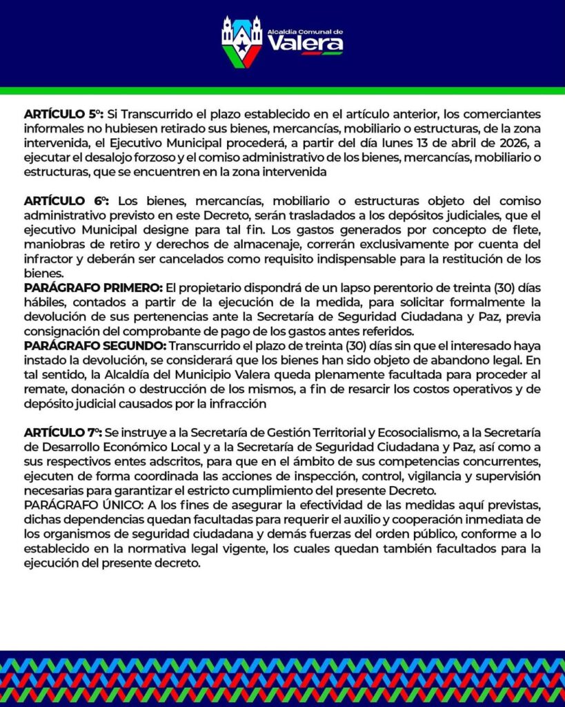 En este decreto, además, se declaran dichas áreas como Zonas de Dominio Público para el Esparcimiento Ciudadano, quedando prohibido realizar cualquier actividad comercial, de servicios o de economía popular que no cuente con la autorización expresa y vigente de la Alcaldía del Municipio Valera.