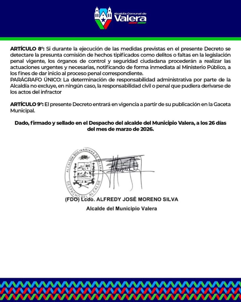 Con la ejecución de este decreto se busca seguir recuperando el orden en el municipio, y acabar con la anarquía para que Valera continúe transformando en una ciudad modelo y referencia a escala nacional, siempre pensando en el bienestar de sus habitantes.
