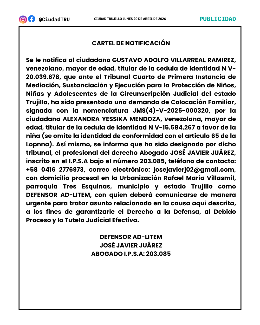 CARTEL DE NOTIFICACIÓN: GUSTAVO ADOLFO VILLARREAL RAMIREZ