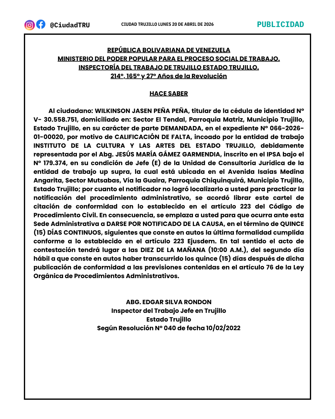 NOTIFICACIÓN: WILKINSON JASEN PEÑA PEÑA