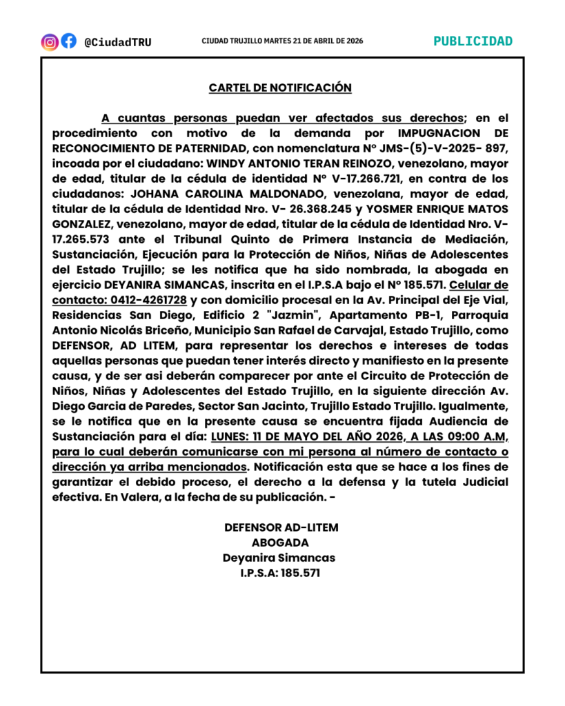 IMPUGNACION DE RECONOCIMIENTO DE PATERNIDAD, con nomenclatura N° JMS-(5)-V-2025- 897, incoada por el ciudadano: WINDY ANTONIO TERAN REINOZO