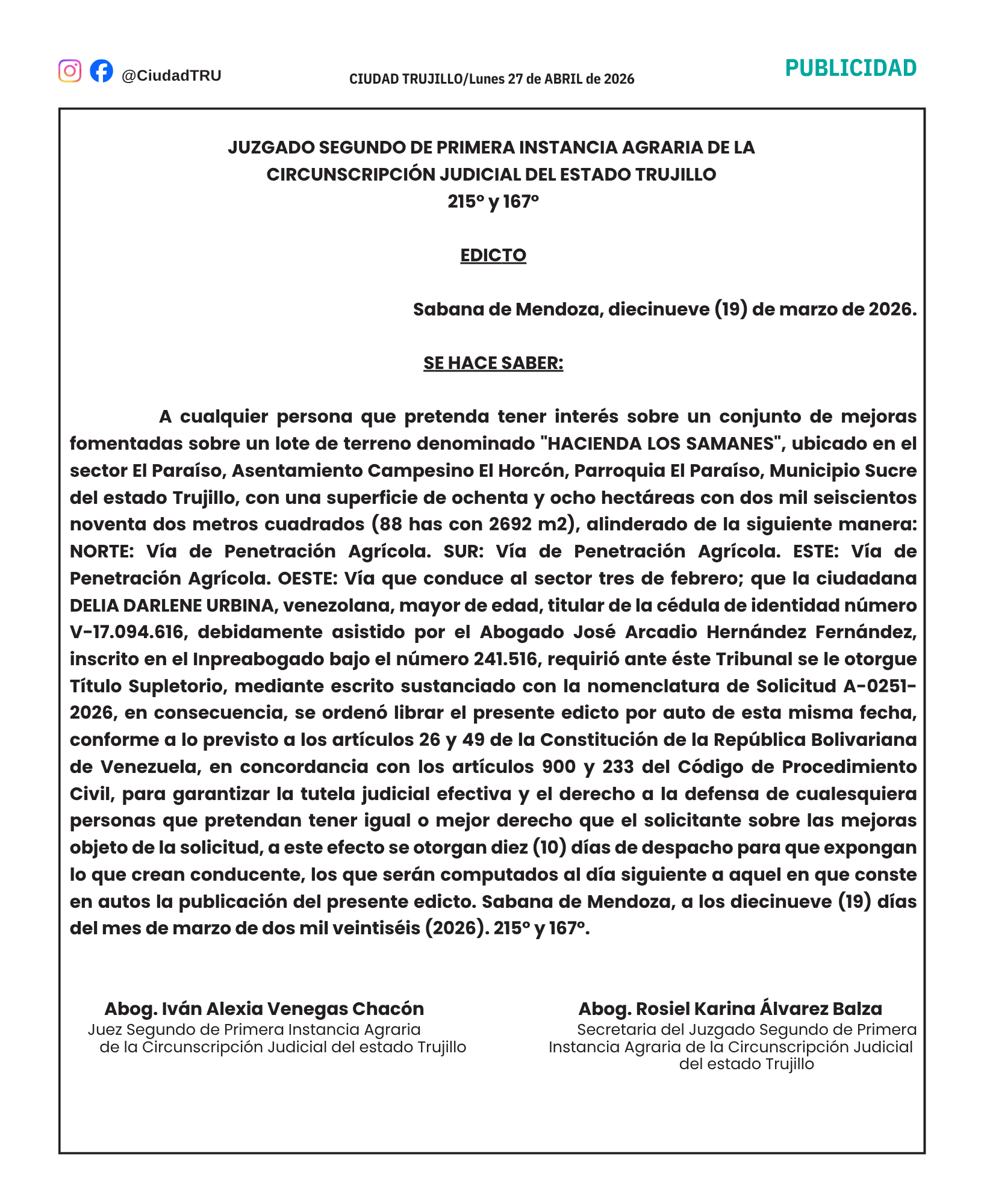 EDICTO: HACIENDA LOS SAMANES