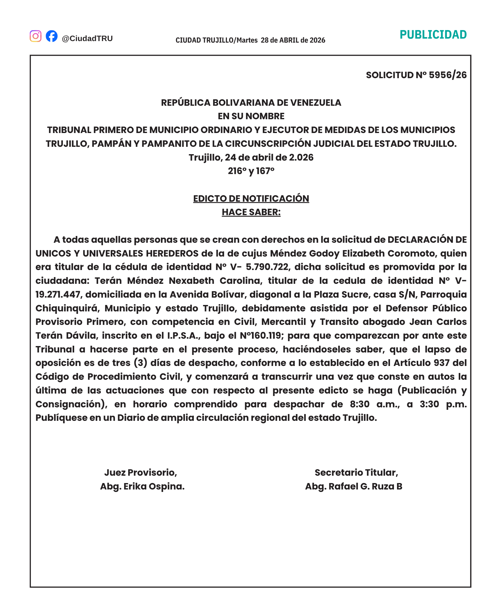 DECLARACIÓN DE UNICOS Y UNIVERSALES HEREDEROS de la de cujus Méndez Godoy Elizabeth Coromoto